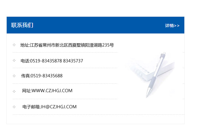 傳真:0519-83435688    郵編:213135    網址:WWW.czjhgj_com.ztxdit.com    電子郵箱:JH@czjhgj_com.ztxdit.com